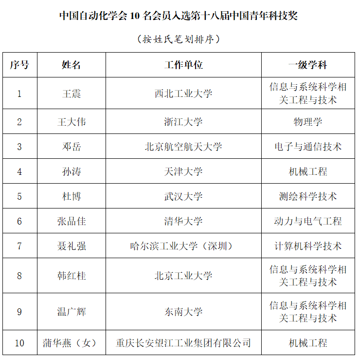 西北工業(yè)大學(xué)教授王震、浙江大學(xué)教授王大偉、北京航空航天大學(xué)教授鄧岳、天津大學(xué)教授孫濤、武漢大學(xué)教授杜博、清華大學(xué)副教授張品佳、哈爾濱工業(yè)大學(xué)(深圳)教授聶禮強、北京工業(yè)大學(xué)教授韓紅桂、東南大學(xué)教授溫廣輝、重慶長安望江工業(yè)集團(tuán)有限公司蒲華燕入選第十八屆中國青年科技獎,其中韓紅桂教授由中國自動化學(xué)會推薦。