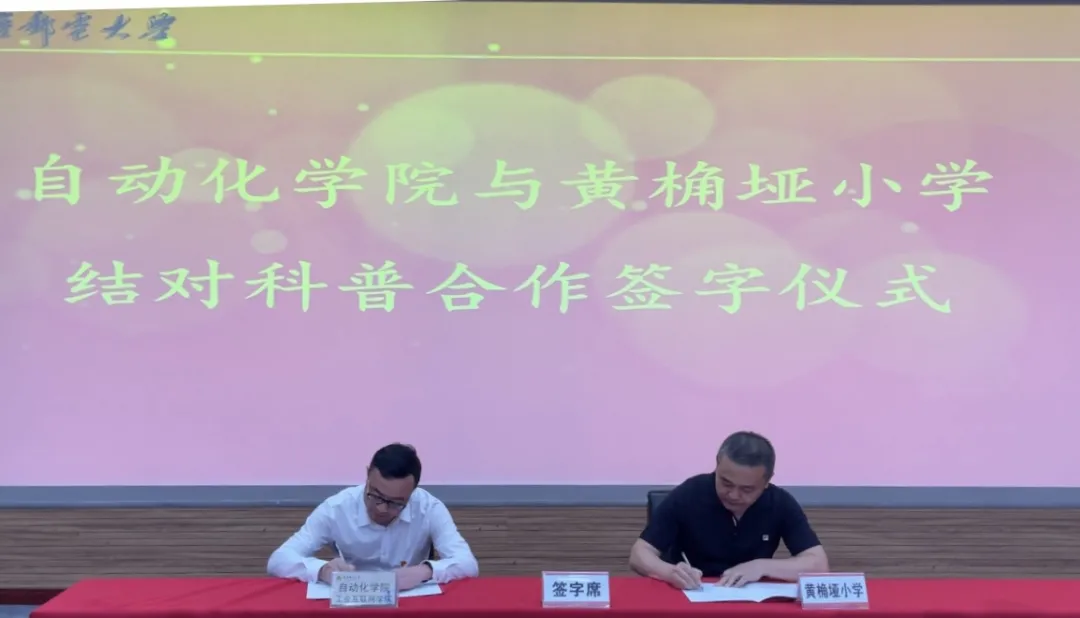 隨后,重慶郵電大學自動化學院與黃桷埡小學進行了科普合作簽字儀式。黃桷埡小學校長徐勇、自動化學院黨委副書記夏萬林作為雙方代表進行了簽字儀式。